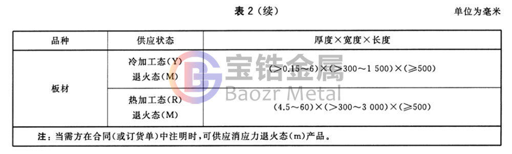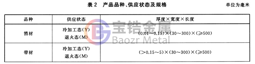 產(chǎn)品牌號應符合表1的規(guī)定,產(chǎn)品品種、供店狀態(tài)及規(guī)格應符合表2的規(guī)定。